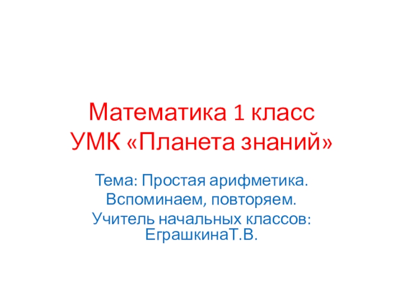 Математика 1 класс УМК «Планета знаний»Тема: Простая арифметика.Вспоминаем, повторяем.Учитель начальных классов: ЕграшкинаТ.В.