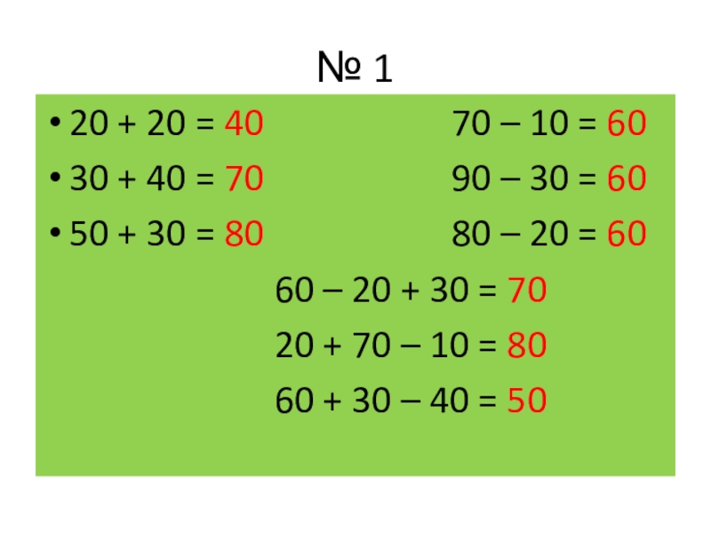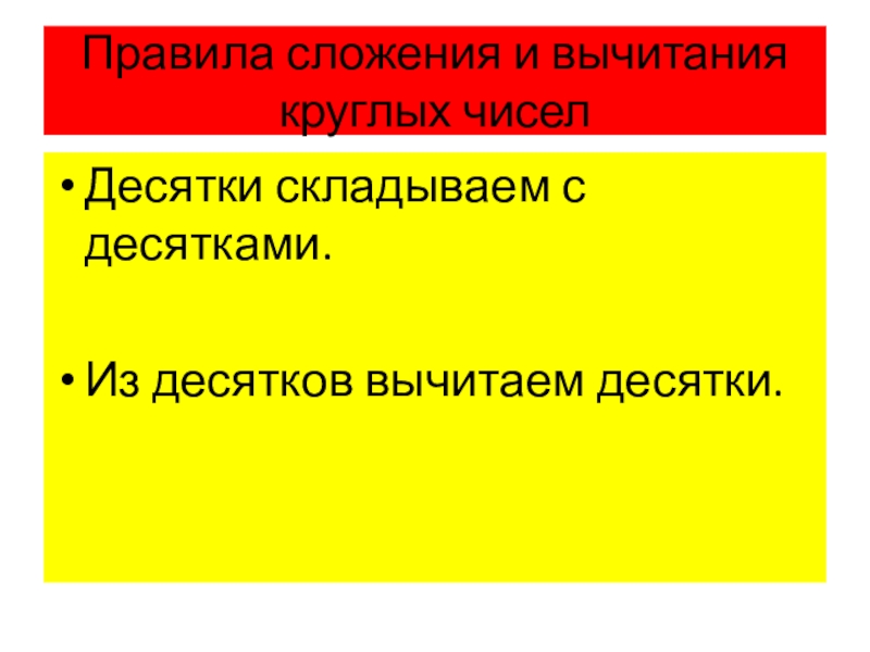 Правила сложения и вычитания круглых чиселДесятки складываем с десятками.Из десятков вычитаем десятки.