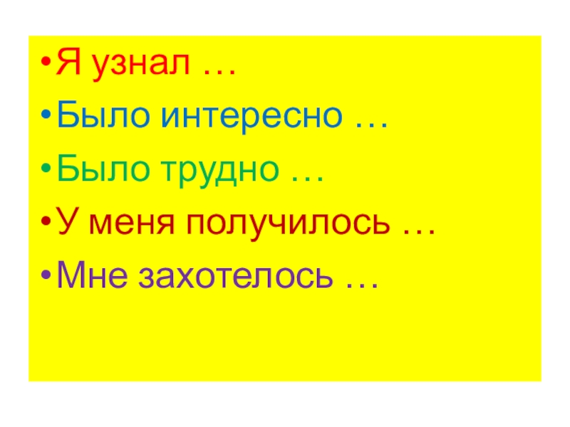 Я узнал …Было интересно …Было трудно …У меня получилось …Мне захотелось …