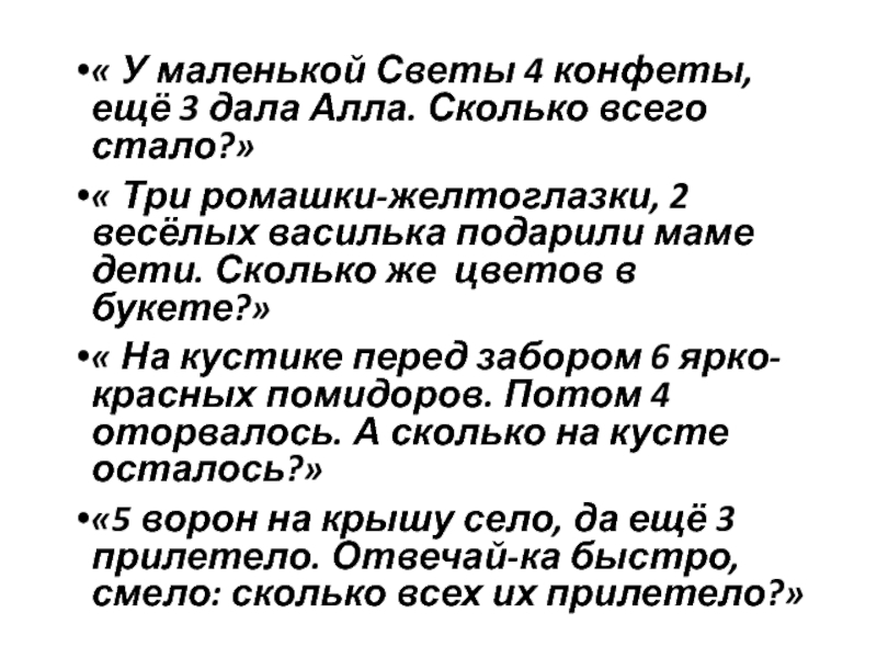 « У маленькой Светы 4 конфеты, ещё 3 дала Алла. Сколько всего стало?»« Три ромашки-желтоглазки, 2 весёлых