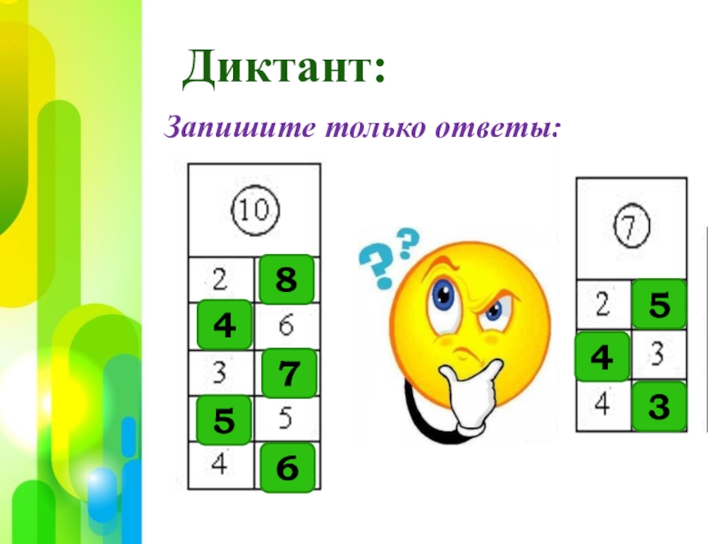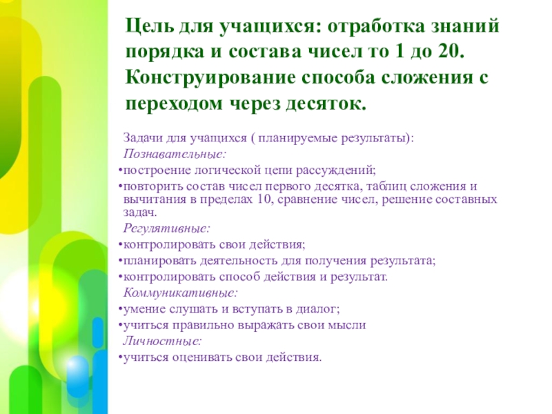 повторить состав чисел первого десятка, таблиц сложения и вычитания в пределах 10, сравнение чисел, решение составных задач.