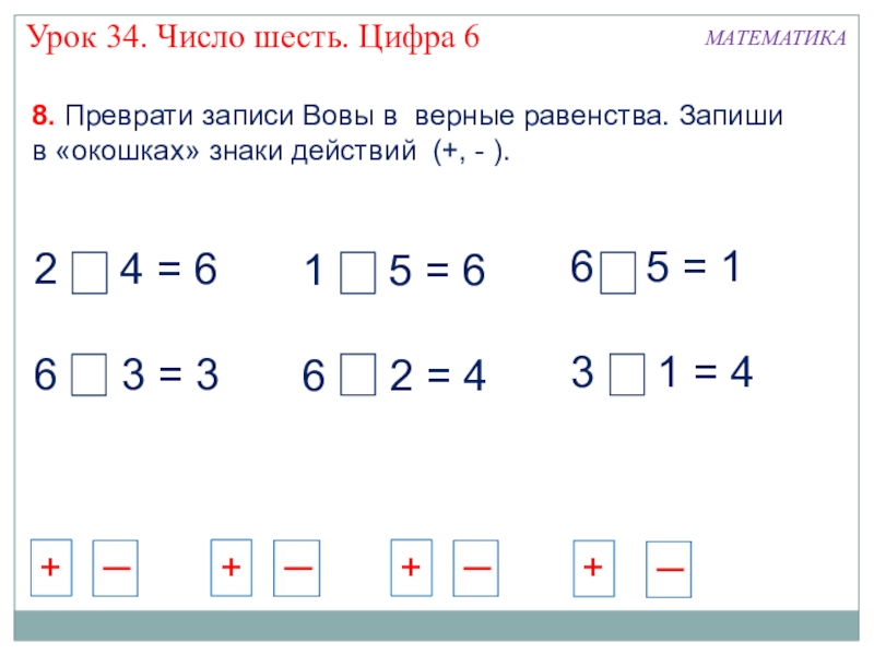 8. Преврати записи Вовы в верные равенства. Запиши в «окошках» знаки действий (+, - ).