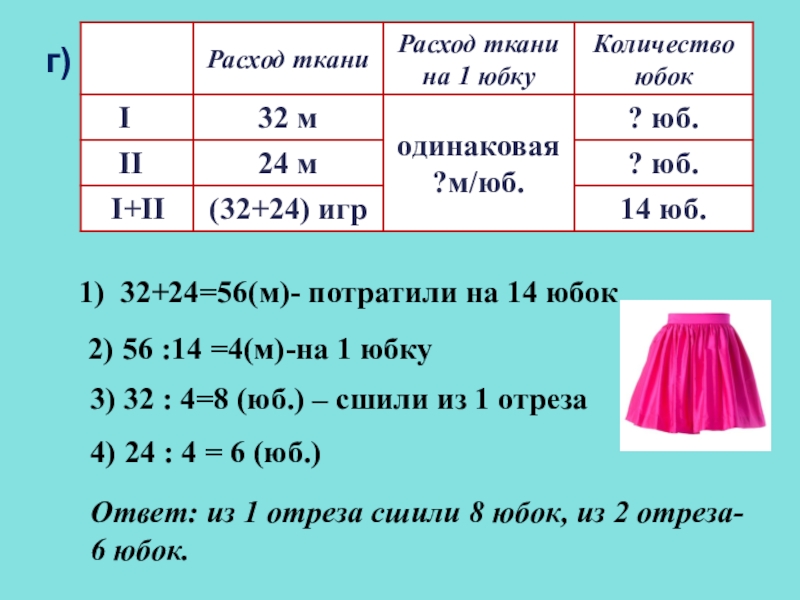 Ответ: из 1 отреза сшили 8 юбок, из 2 отреза- 6 юбок.