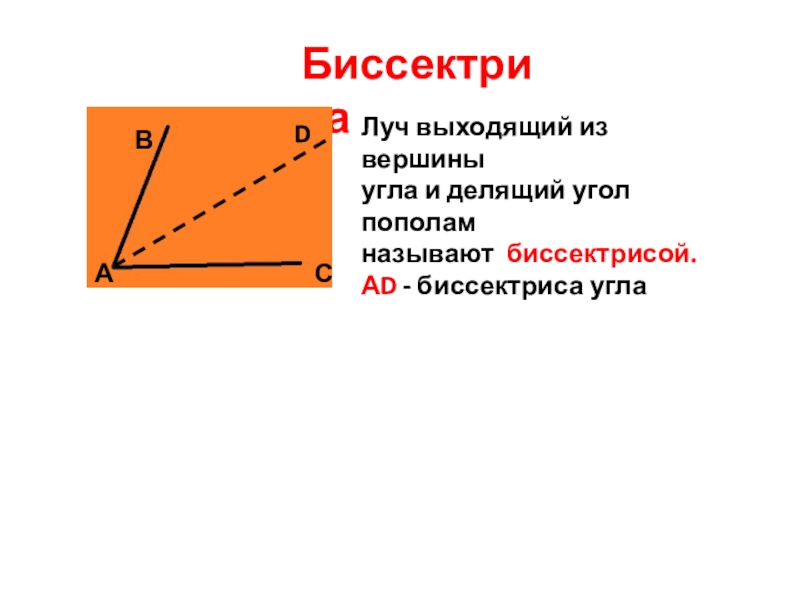 БиссектрисаАВСDЛуч выходящий из вершины угла и делящий угол пополамназывают биссектрисой.АD - биссектриса угла