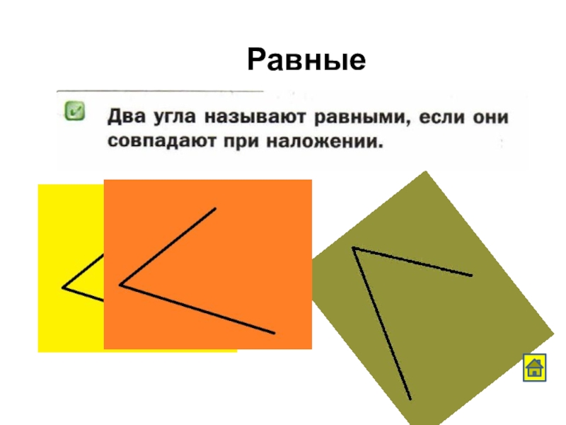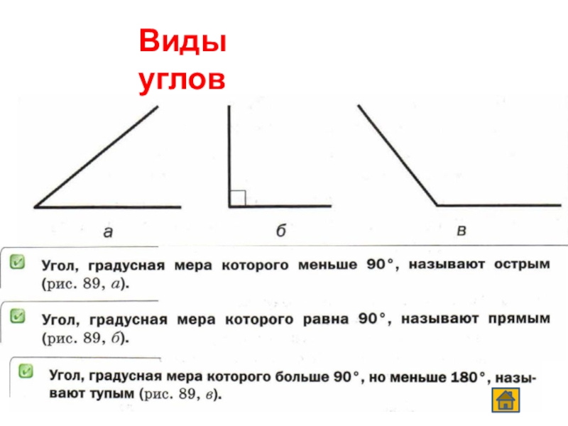 Слайд 11. Виды углов 2. Равные углы 3. Измерение углов 4. задачи