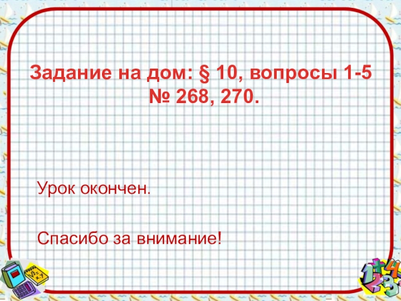 Задание на дом: § 10, вопросы 1-5  № 268, 270.Урок окончен.Спасибо за внимание!