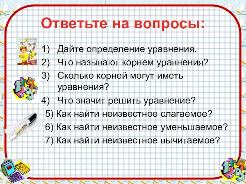 Ответьте на вопросы:Дайте определение уравнения.Что называют корнем уравнения?Сколько корней могут иметь уравнения?Что значит решить уравнение?5) Как найти