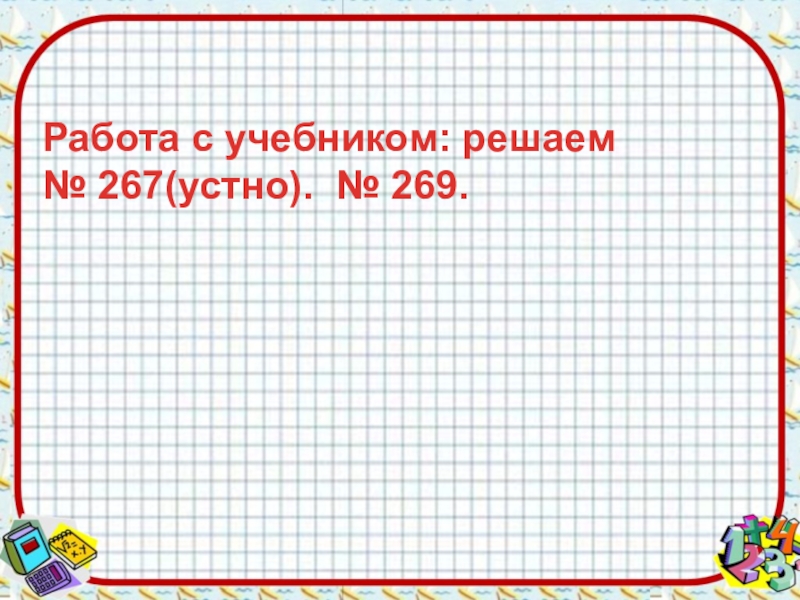 Слайд 12Работа с учебником: решаем № 267(устно). № 269.