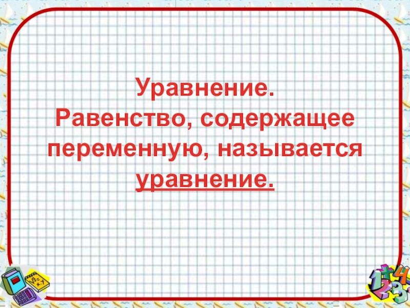 Слайд 4 Уравнение. Равенство, содержащее переменную, называется уравнение.