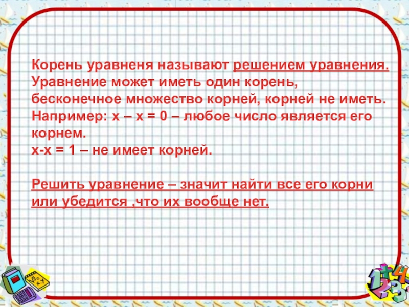 корней, корней не иметь. Например: х – х = 0 – любое число является его корнем. х-х = 1 – не имеет корней. Решить уравнение – значит найти все его корни или убедится ,что их вообще нет.