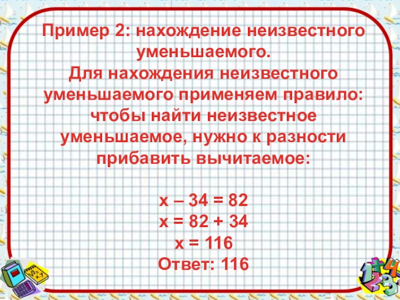 Слайд 10Пример 2: нахождение неизвестного уменьшаемого. Для нахождения неизвестного уменьшаемого применяем правило: чтобы