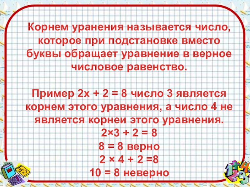 в верное числовое равенство. Пример 2х + 2 = 8 число 3 является корнем этого уравнения, а число 4 не является корнеи этого уравнения. 2×3 + 2 = 8 8 = 8 верно 2 × 4 + 2 =8 10 = 8 неверно