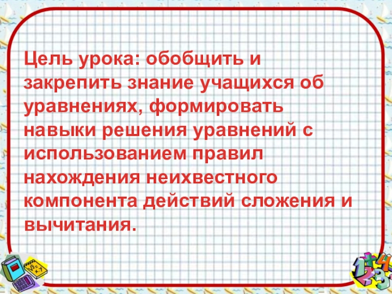 Цель урока: обобщить и закрепить знание учащихся об уравнениях, формировать навыки решения уравнений с использованием правил нахождения неихвестного компонента действий сложения и вычитания.