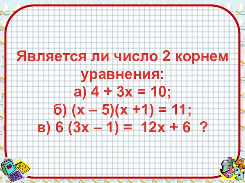 Слайд 7Является ли число 2 корнем уравнения: а) 4 + 3х = 10; б)