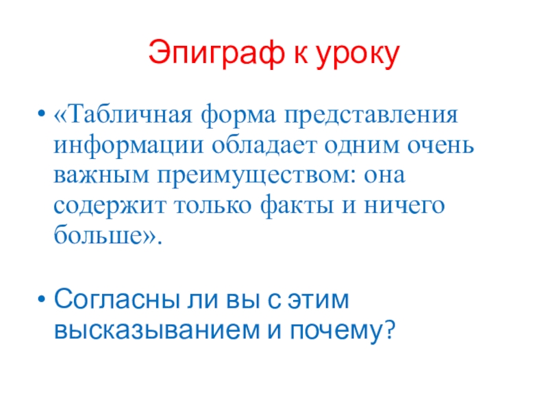 Эпиграф к уроку«Табличная форма представления информации обладает одним очень важным преимуществом: она содержит только факты и ничего больше». Согласны ли вы с этим высказыванием и почему?
