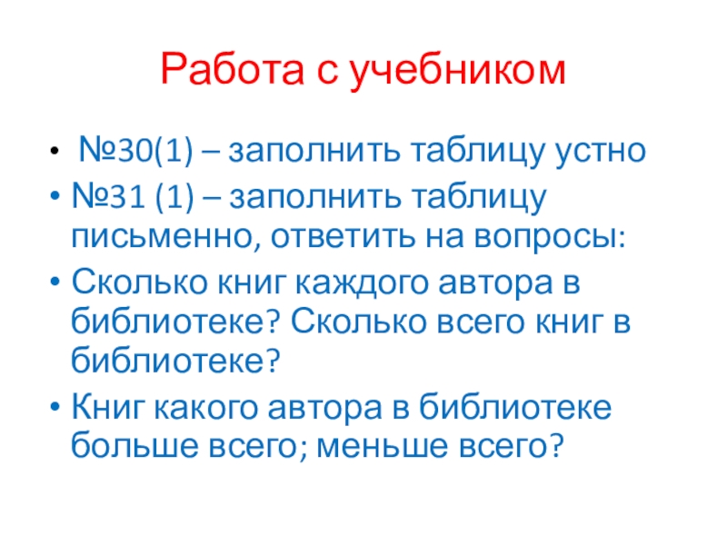 Работа с учебником №30(1) – заполнить таблицу устно№31 (1) – заполнить таблицу письменно, ответить на вопросы:Сколько книг