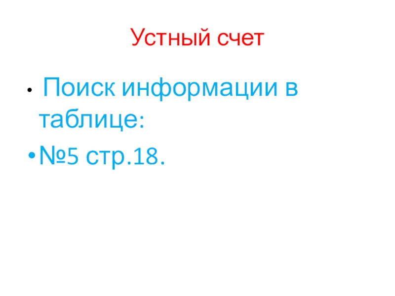 Устный счет Поиск информации в таблице:№5 стр.18.