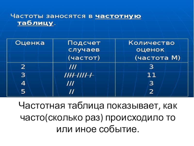Слайд 5Частотная таблица показывает, как часто(сколько раз) происходило то или иное событие.