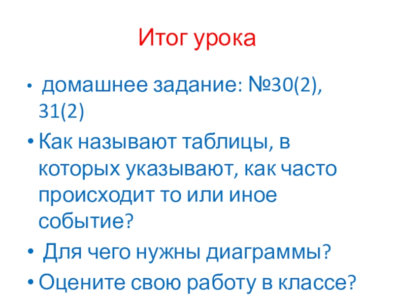 Итог урока домашнее задание: №30(2), 31(2)Как называют таблицы, в которых указывают, как часто происходит то или иное