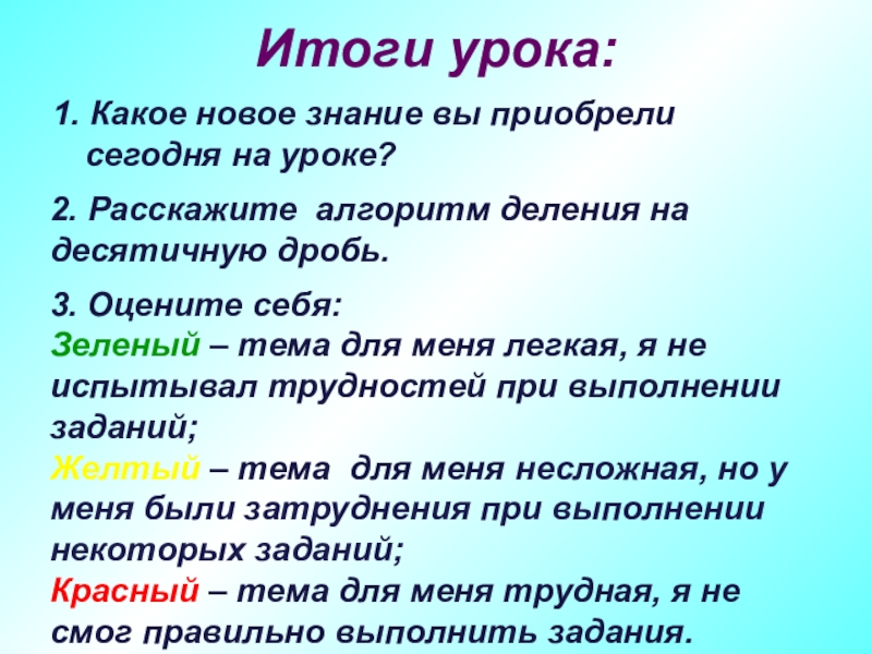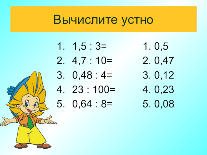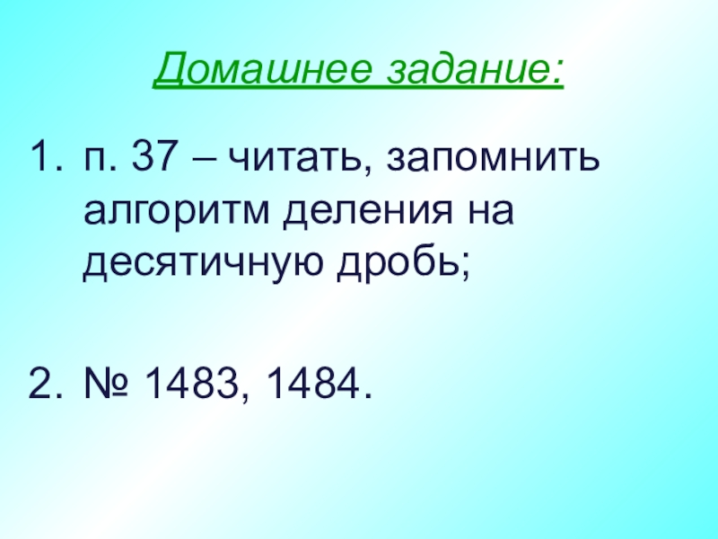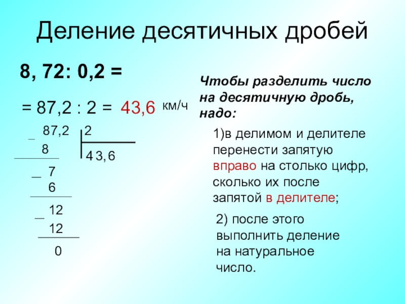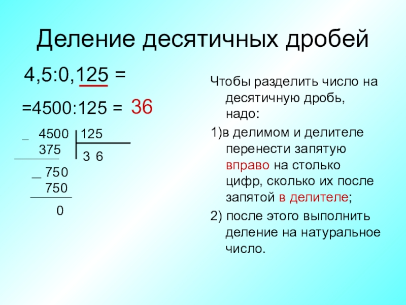 1)в делимом и делителе перенести запятую вправо на столько цифр, сколько их после запятой в делителе;
