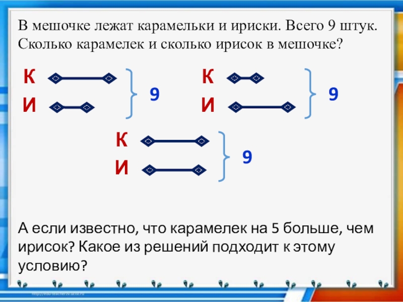 А если известно, что карамелек на 5 больше, чем ирисок? Какое из решений подходит к этому условию?
