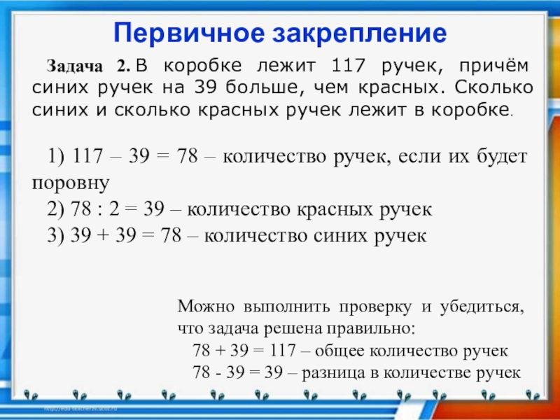 1) 117 – 39 = 78 – количество ручек, если их будет поровну