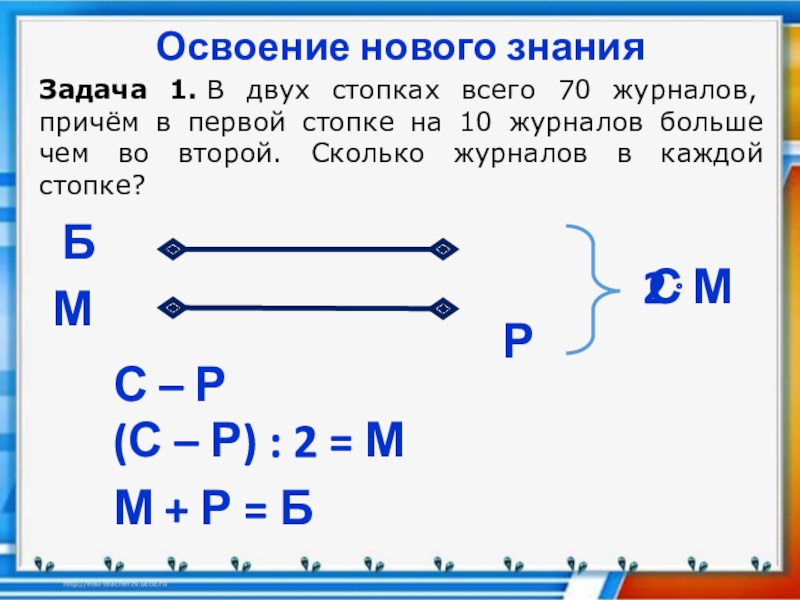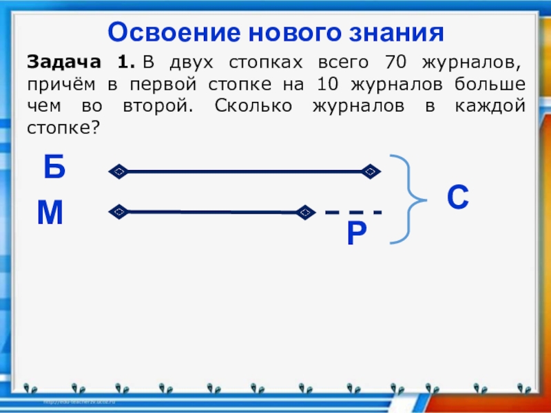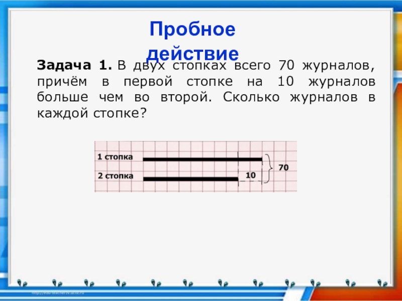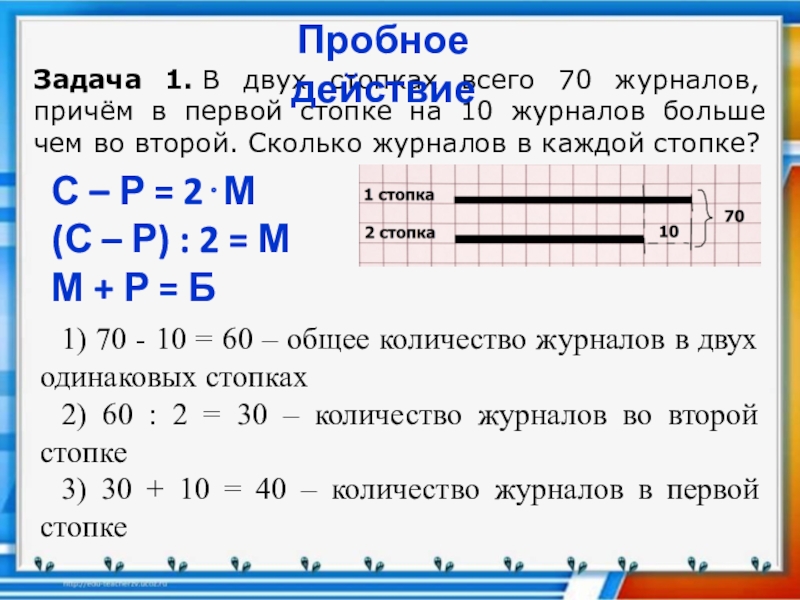 1) 70 - 10 = 60 – общее количество журналов в двух одинаковых стопках
