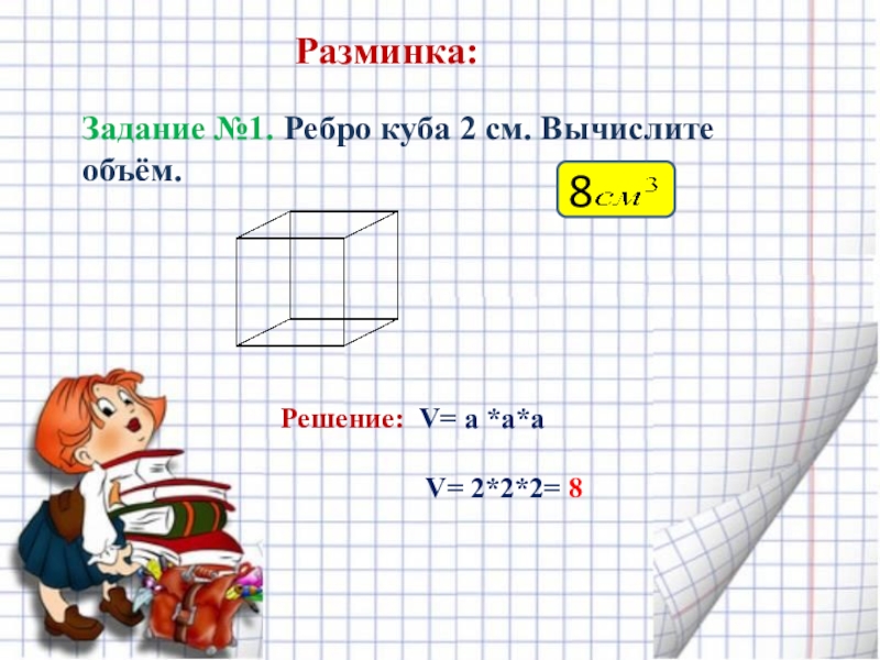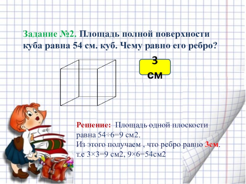 Решение: Площадь одной плоскости равна 54÷6=9 см2.