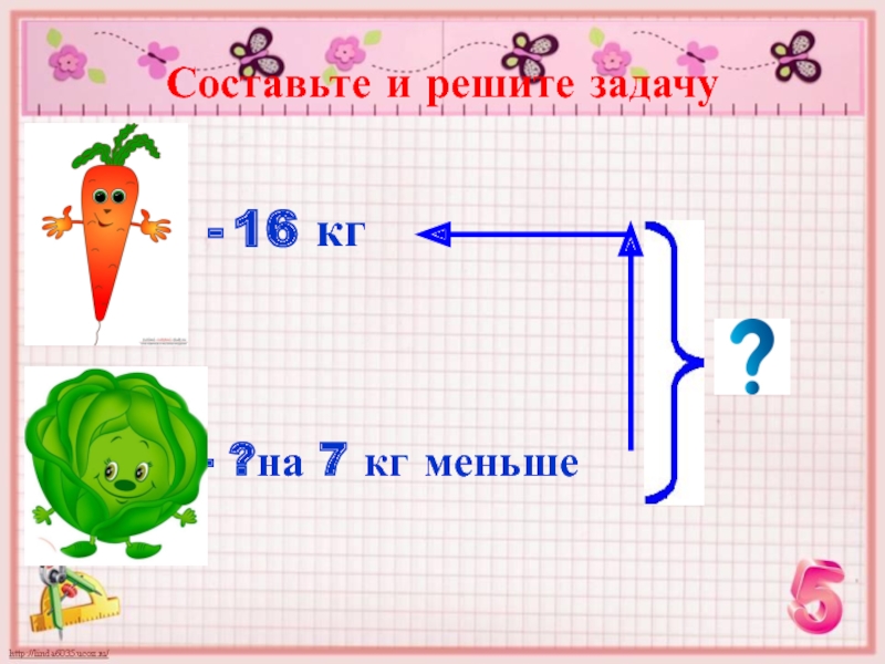Составьте и решите задачу16 кг- ?на 7 кг меньше