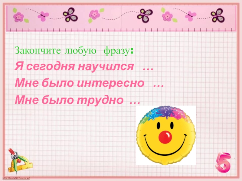 Закончите любую фразу:Я сегодня научился  …Мне было интересно  …Мне было трудно …