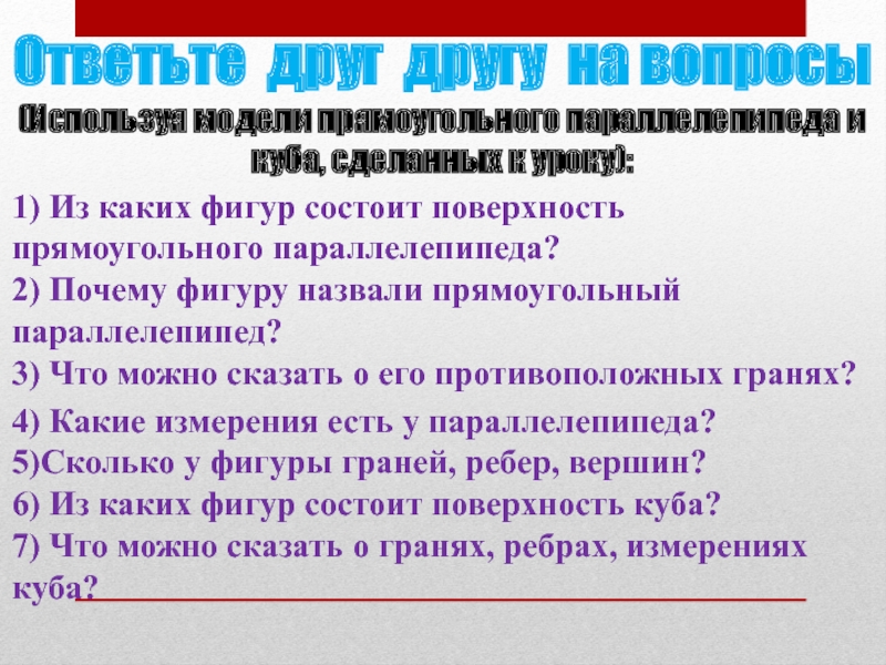 4) Какие измерения есть у параллелепипеда? 5)Сколько у фигуры граней, ребер, вершин?