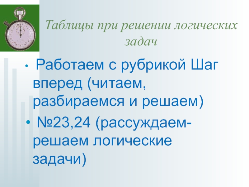Таблицы при решении логических задач Работаем с рубрикой Шаг вперед (читаем, разбираемся и решаем) №23,24 (рассуждаем- решаем