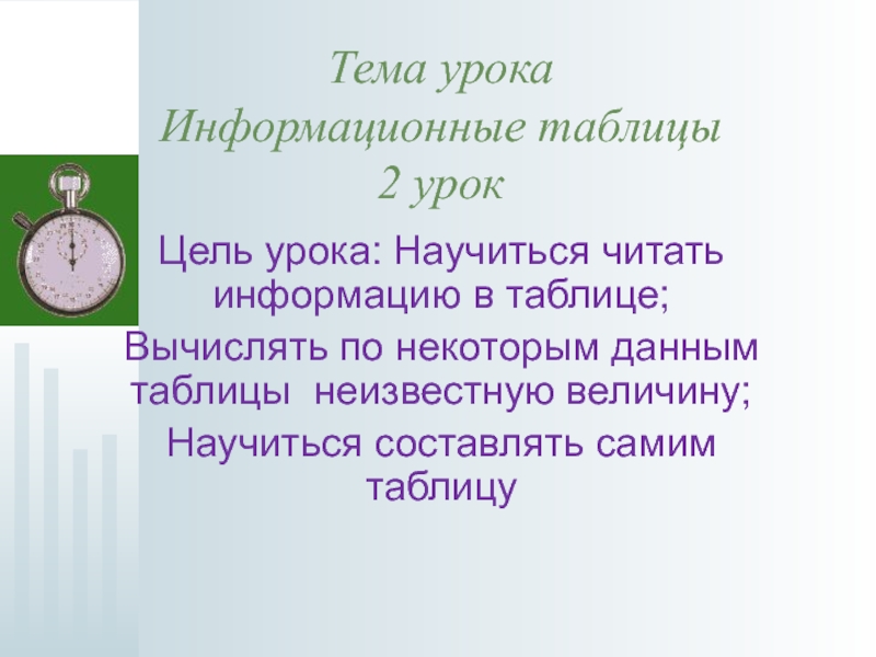 Тема урока Информационные таблицы 2 урокЦель урока: Научиться читать информацию в таблице;Вычислять по некоторым данным таблицы неизвестную величину;Научиться составлять самим таблицу