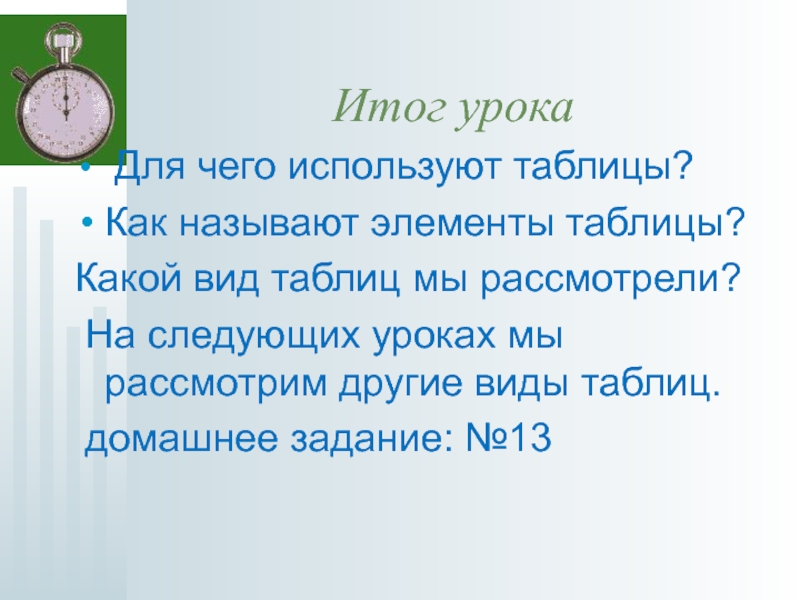 Итог урока Для чего используют таблицы? Как называют элементы таблицы?Какой вид таблиц мы рассмотрели? На следующих уроках