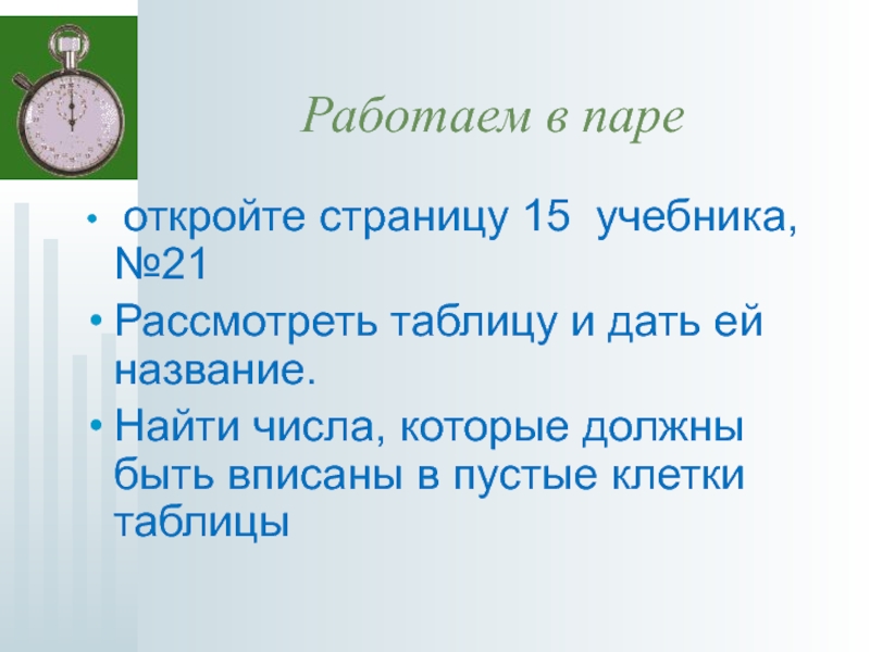 Работаем в паре откройте страницу 15 учебника, №21Рассмотреть таблицу и дать ей название. Найти числа, которые должны