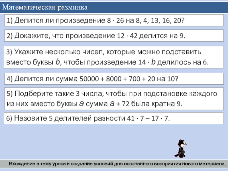 1) Делится ли произведение 8 ∙ 26 на 8, 4, 13, 16, 20?