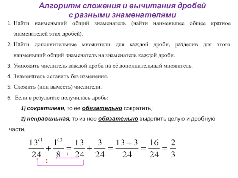 Алгоритм сложения и вычитания дробей с разными знаменателямиНайти наименьший общий знаменатель (найти наименьшее общее кратное знаменателей этих