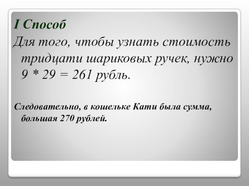 I СпособДля того, чтобы узнать стоимость тридцати шариковых ручек, нужно 9 * 29 = 261 рубль.Следовательно, в