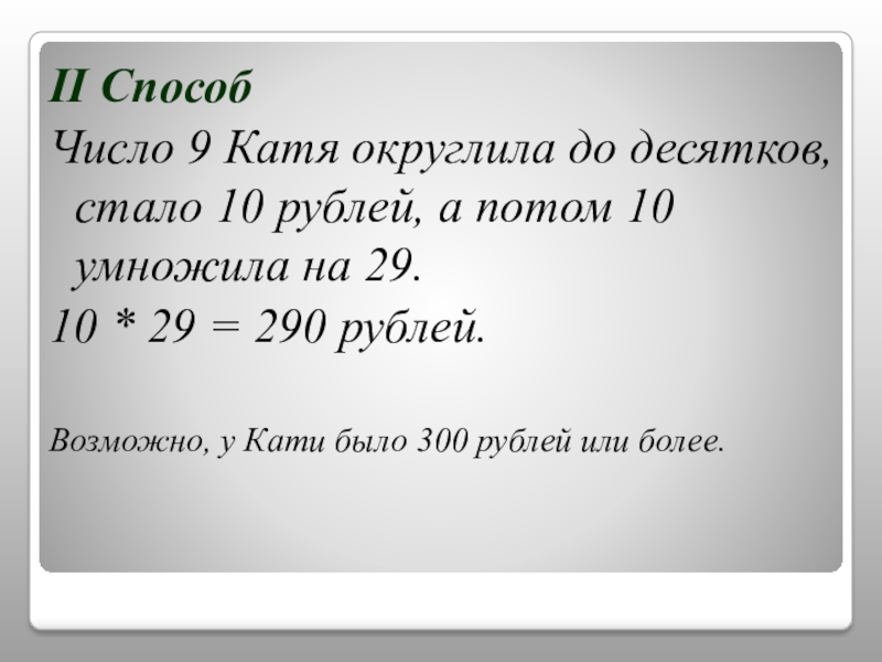 II СпособЧисло 9 Катя округлила до десятков, стало 10 рублей, а потом 10 умножила на 29. 10