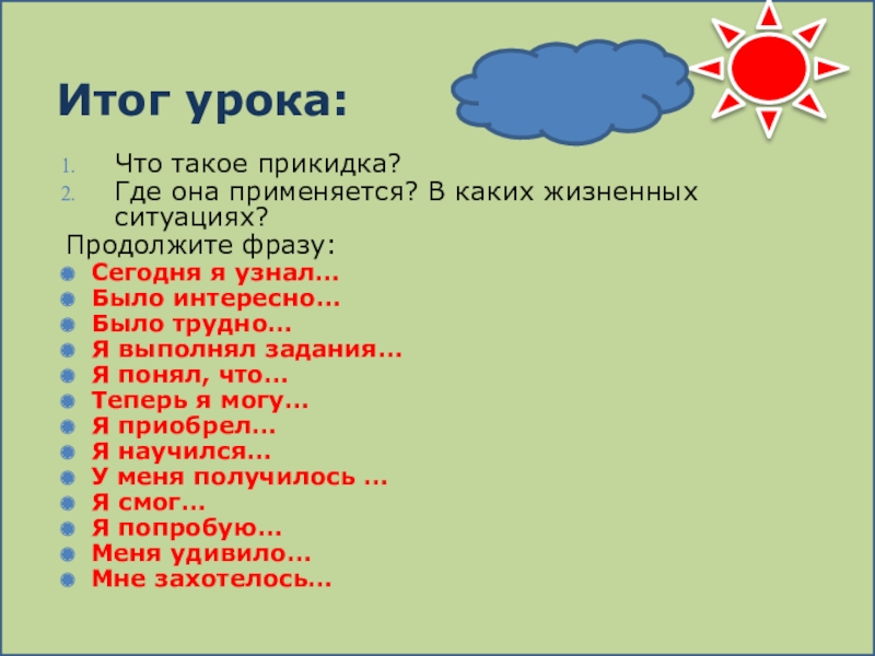 Итог урока:Что такое прикидка? Где она применяется? В каких жизненных ситуациях? Продолжите фразу:Сегодня я узнал…Было интересно…Было трудно…Я