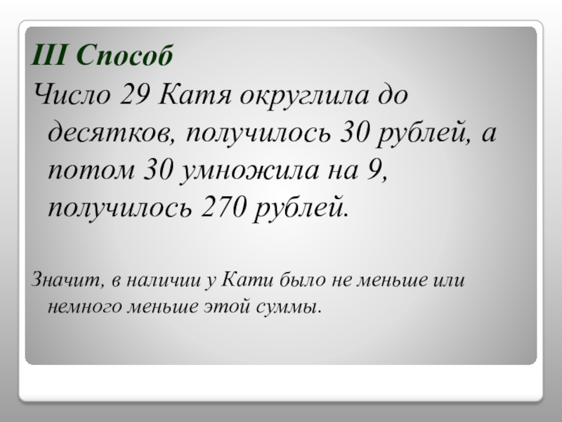 III СпособЧисло 29 Катя округлила до десятков, получилось 30 рублей, а потом 30 умножила на 9, получилось