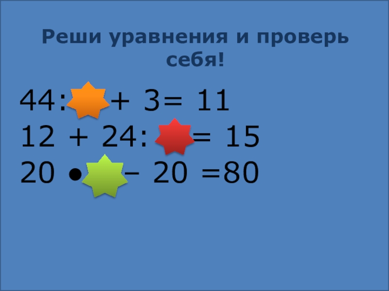 Реши уравнения и проверь себя!44: 4 + 3= 1112 + 24: 8 = 1520 ● 5 –