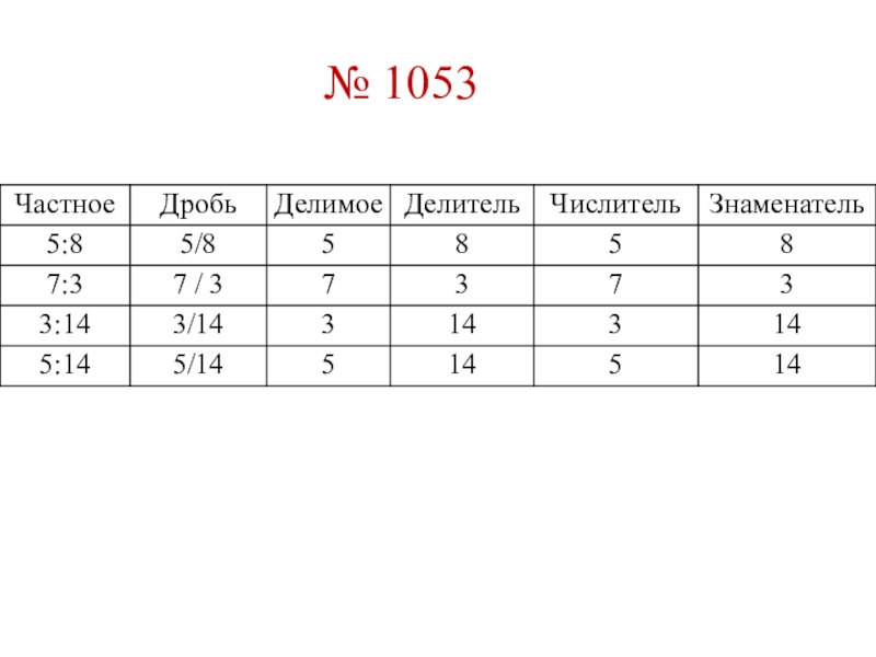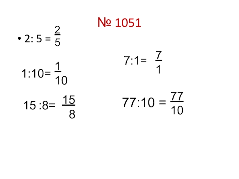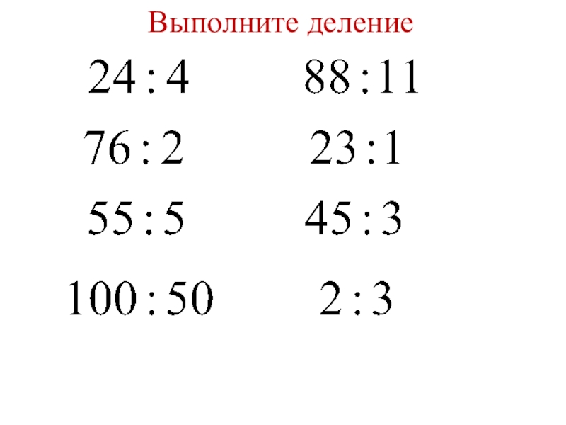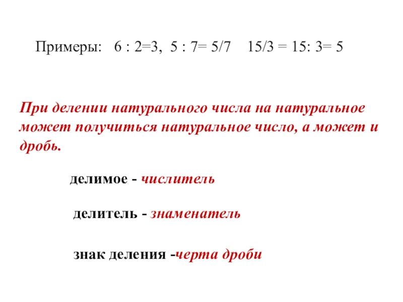 Примеры: 6 : 2=3, 5 : 7= 5/7 15/3 = 15: 3= 5