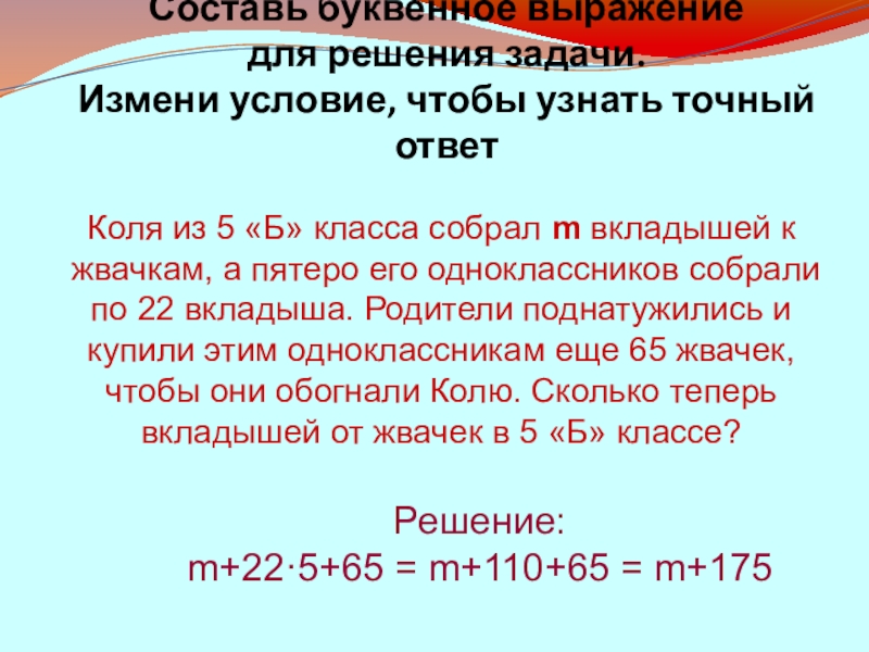 Коля из 5 «Б» класса собрал m вкладышей к жвачкам, а пятеро его одноклассников собрали по 22 вкладыша. Родители поднатужились и купили этим одноклассникам еще 65 жвачек, чтобы они обогнали Колю. Сколько теперь вкладышей от жвачек в 5 «Б» классе?
