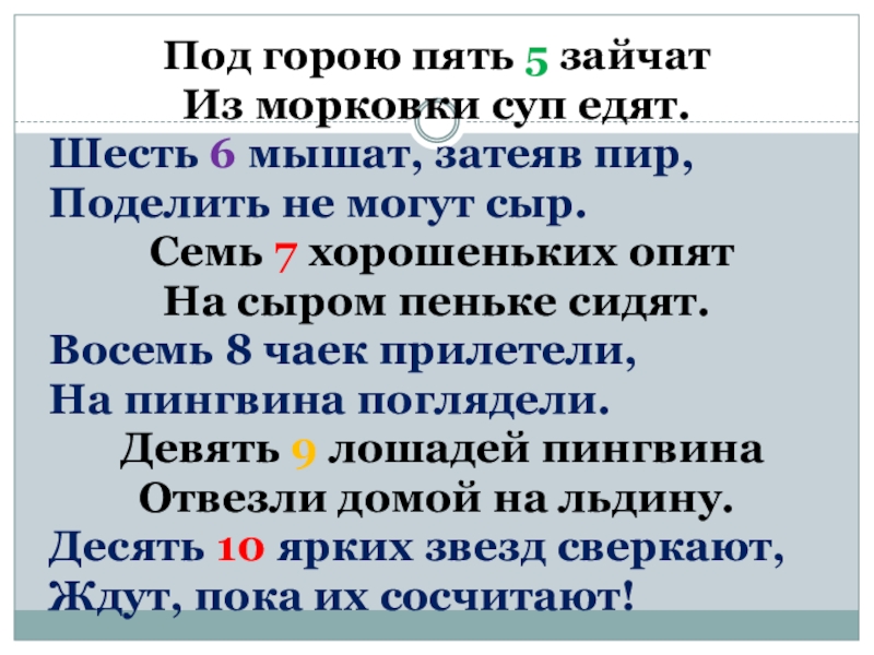 Под горою пять 5 зайчат Из морковки суп едят.Шесть 6 мышат, затеяв пир,Поделить не могут сыр. Семь 7 хорошеньких опятНа сыром пеньке сидят.Восемь 8 чаек прилетели,На