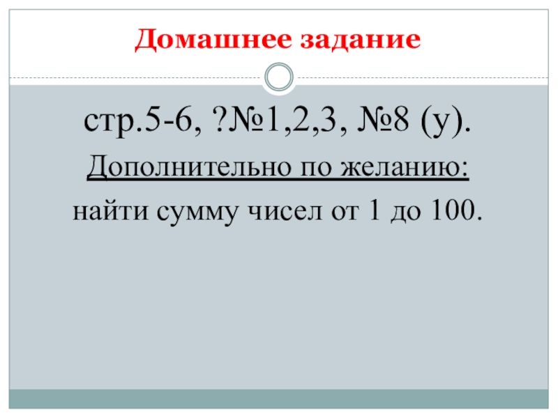 Домашнее задание стр.5-6, ?№1,2,3, №8 (у).Дополнительно по желанию: найти сумму чисел от 1 до 100.