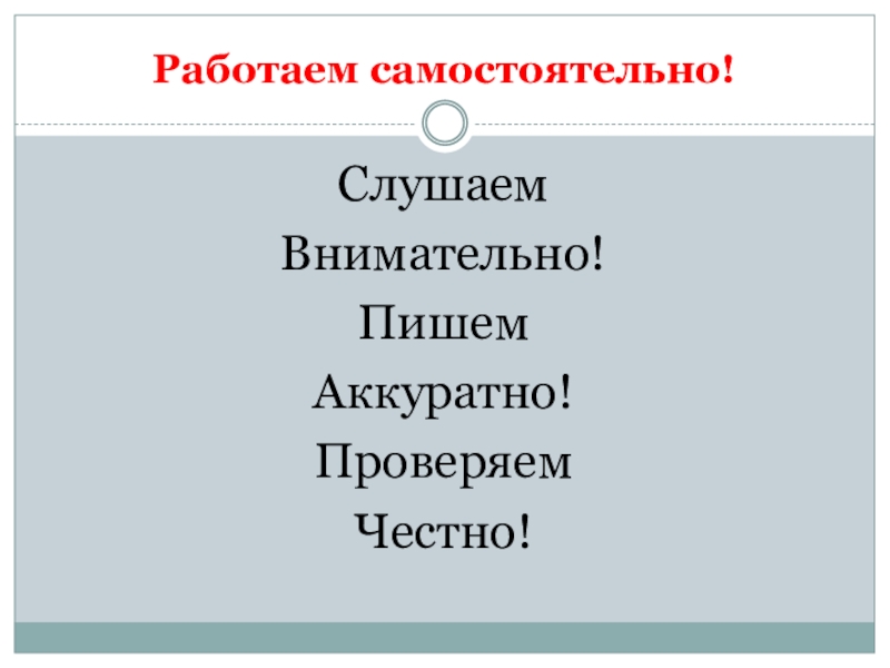 Работаем самостоятельно!СлушаемВнимательно!ПишемАккуратно!ПроверяемЧестно!