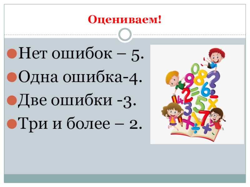Оцениваем!Нет ошибок – 5.Одна ошибка-4.Две ошибки -3.Три и более – 2.