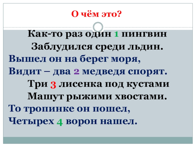 О чём это?Как-то раз один 1 пингвинЗаблудился среди льдин.Вышел он на берег моря,Видит – два 2 медведя спорят. Три 3 лисенка под кустамиМашут рыжими хвостами.То тропинке он пошел,Четырех 4 ворон нашел.