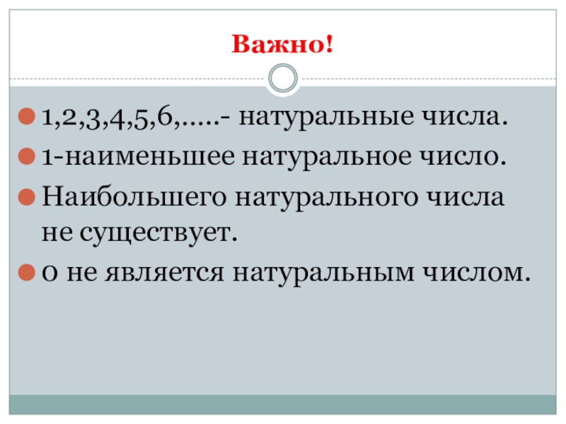 Важно!1,2,3,4,5,6,…..- натуральные числа.1-наименьшее натуральное число.Наибольшего натурального числа не существует.0 не является натуральным числом.